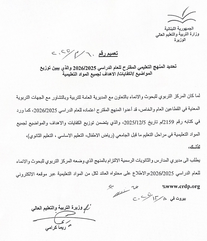 المنهج التعليمي للعام ٢٠٢٥- ٢٠٢٦، وزارة التربية والتعليم العالي - المركز التربوي للبحوث والانماء، استنادا إلى التعميم رقم ٦٠/م/ ٢.٢٥